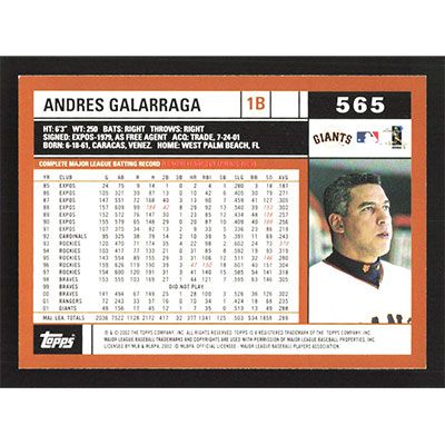 This is a 2002 Topps Andres Galarraga baseball card. The card is #565 and pictures show condition.