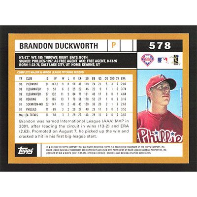 This is a 2002 Topps Brandon Duckworth baseball card. The card is #578 and pictures show condition.