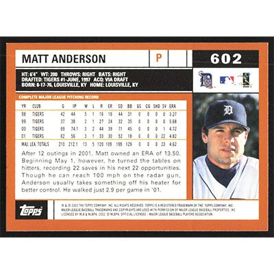 This is a 2002 Topps Matt Anderson baseball card. The card is #602 and pictures show condition.
