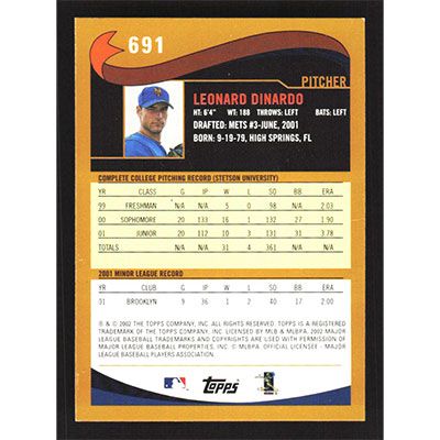 This is a 2002 Topps Leonard Dinardo Draft Picks baseball card. The card is #691 and pictures show condition.