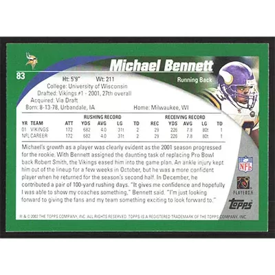 This is a 2002 Topps Michael Bennett football card. The card is #83 and pictures show condition.