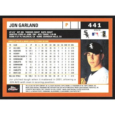 This is a 2002 Topps Chrome Gold Refractors Jon Garland baseball card. The card is #441 and pictures show condition.