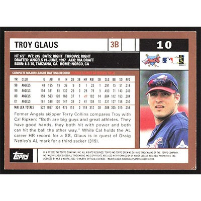 This is a 2002 Topps Opening Day Troy Glaus baseball card. The card is #10 and pictures show condition.