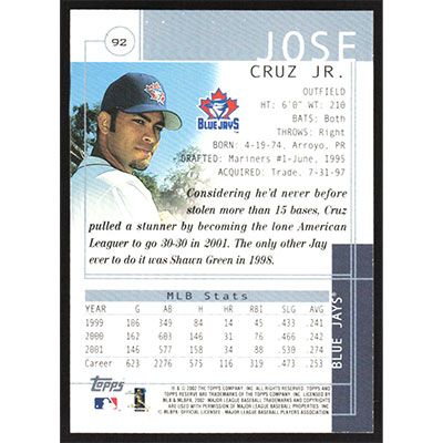 This is a 2002 Topps Reserve Jose Cruz Jr. baseball card. The card is #92 and pictures show condition.
