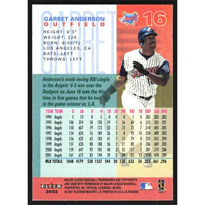This is a 2002 Ultra Garret Anderson baseball card. The card is #16 and pictures show condition.