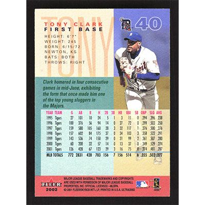 This is a 2002 Ultra Tony Clark baseball card. The card is #40 and pictures show condition.