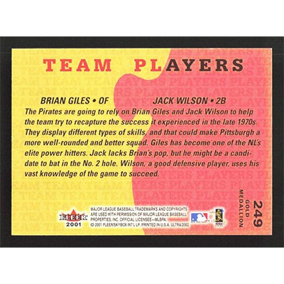 This is a 2002 Ultra Gold Medallion Brian Giles and Jack Wilson Team Players baseball card. The card is #249 and pictures show condition. Team(s): Pittsburgh Pirates