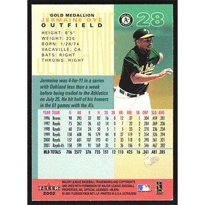 This is a 2002 Ultra Gold Medallion Jermaine Dye baseball card. The card is #28 and pictures show condition.