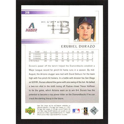 This is a 2002 Upper Deck Erubiel Durazo baseball card. The card is #318 and pictures show condition.