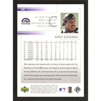 This is a 2002 Upper Deck Tony Eusebio baseball card. The card is #725 and pictures show condition.