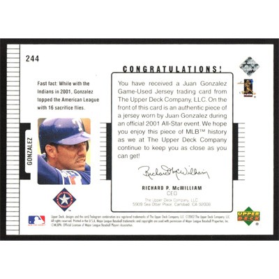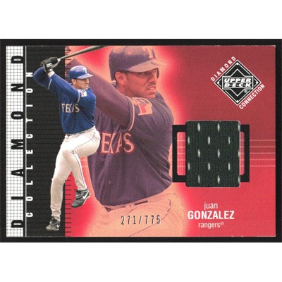 This is a 2002 Upper Deck Diamond Connection Juan Gonzalez Game-Used Jersey baseball card. The card is #244 and pictures show condition. This card is limited; #'d 271/775.