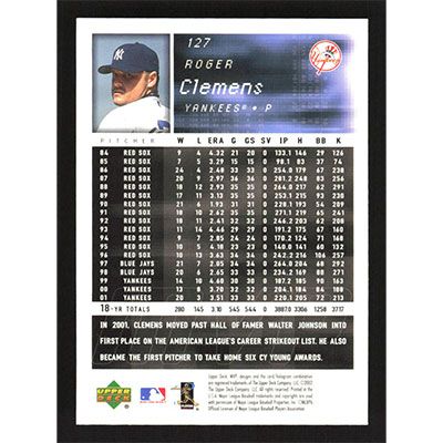 This is a 2002 Upper Deck MVP Roger Clemens baseball card. The card is #127 and pictures show condition.
