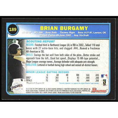This is a 2003 Bowman Brian Burgamy baseball card. The card is #189 and pictures show condition.