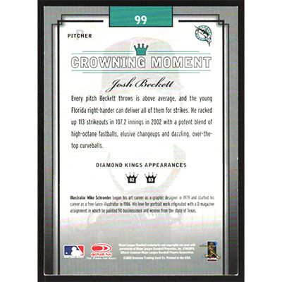 This is a 2003 Diamond Kings Josh Beckett baseball card. The card is #99 and pictures show condition.