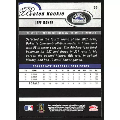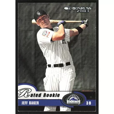 This is a 2003 Donruss Jeff Baker Rated Rookie baseball card. The card is #55 and pictures show condition. Team(s): Colorado Rockies Rookie Card (RC)