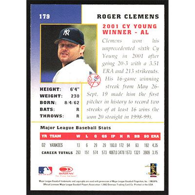This is a 2003 Donruss Champions Roger Clemens baseball card. The card is #179 and pictures show condition.