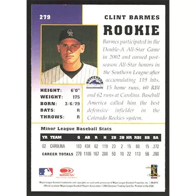 This is a 2003 Donruss Champions Clint Barmes baseball card. The card is #279 and pictures show condition. Team(s): Colorado Rockies Rookie Card (RC)