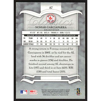 This is a 2003 Donruss Classics Nomar Garciaparra baseball card. The card is #87 and pictures show condition.