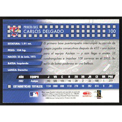 This is a 2003 Donruss Estrellas Carlos Delgado baseball card. The card is #100 and pictures show condition.