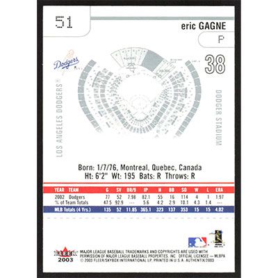 This is a 2003 Fleer Authentix Eric Gagne baseball card. The card is #51 and pictures show condition.