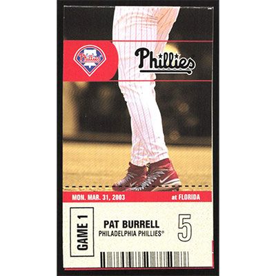 This is a 2003 Fleer Authentix Ticket Studs Pat Burrell baseball card. The card is #10 and pictures show condition.
