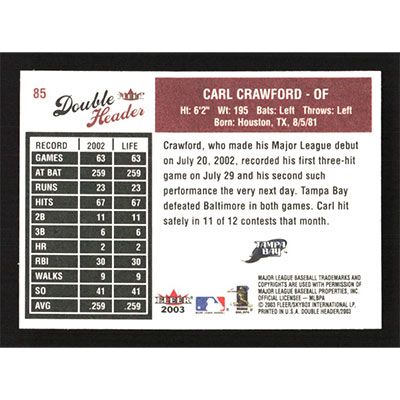 This is a 2003 Fleer Double Header Carl Crawford baseball card. The card is #85 and pictures show condition.