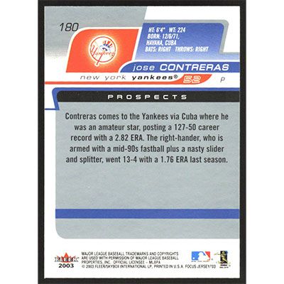 This is a 2003 Fleer Focus Jersey Edition Jose Contreras baseball card. The card is #180 and pictures show condition. Team(s): New York Yankees Rookie Card (RC)