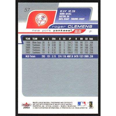 This is a 2003 Fleer Focus Jersey Edition Roger Clemens baseball card. The card is #57 and pictures show condition.