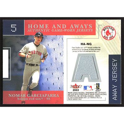 This is a 2003 Fleer Focus Jersey Edition Home and Aways Game Jersey Nomar Garciaparra baseball card. The card is #HA-NG and pictures show condition. Team(s): Boston Red Sox