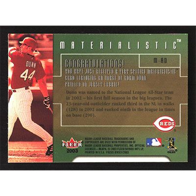 This is a 2003 Fleer Focus Jersey Edition Materialistic Action Away Adam Dunn baseball card. The card is #M-AD and pictures show condition. Team(s): Cincinnati Reds