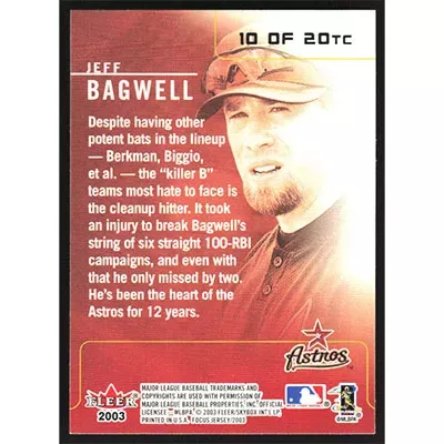 This is a 2003 Fleer Focus Jersey Edition Team Colors Jeff Bagwell baseball card. The card is #10 and pictures show condition.
