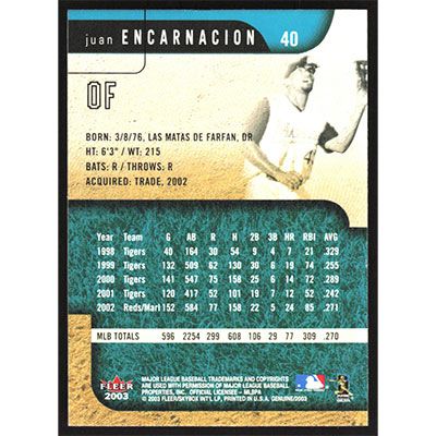 This is a 2003 Fleer Genuine Juan Encarnacion baseball card. The card is #40 and pictures show condition.