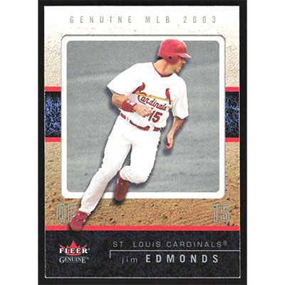 This is a 2003 Fleer Genuine Jim Edmonds baseball card. The card is #64 and pictures show condition.