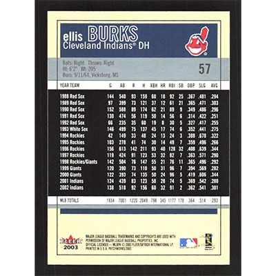 This is a 2003 Fleer Patchworks Ellis Burks baseball card. The card is #57 and pictures show condition.