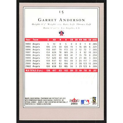 This is a 2003 Fleer Rookies & Greats Garret Anderson baseball card. The card is #15 and pictures show condition.