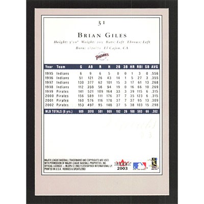 This is a 2003 Fleer Rookies & Greats Brian Giles baseball card. The card is #31 and pictures show condition.