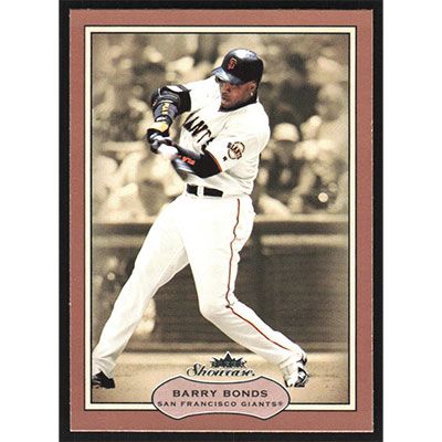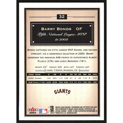 This is a 2003 Fleer Showcase Barry Bonds baseball card. The card is #32 and pictures show condition.