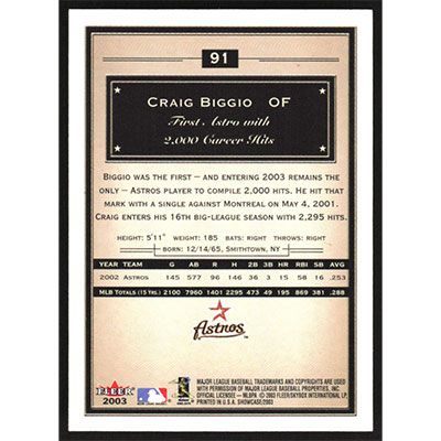 This is a 2003 Fleer Showcase Craig Biggio baseball card. The card is #91 and pictures show condition.