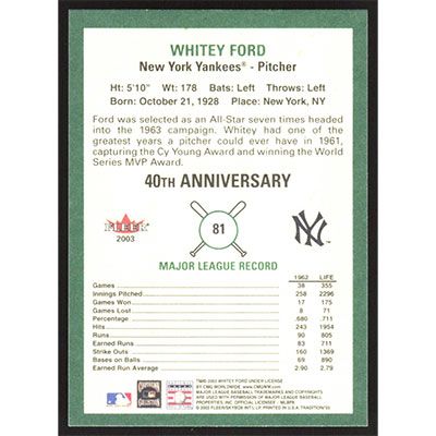 This is a 2003 Fleer Tradition Whitey Ford short print baseball card. The card is #81 and pictures show condition.