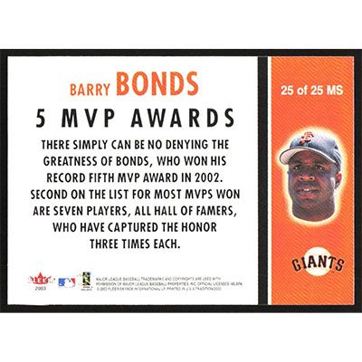 This is a 2003 Fleer Tradition Milestones Barry Bonds 5 MVP Awards baseball card. The card is #25 and pictures show condition. Team(s): San Francisco Giants