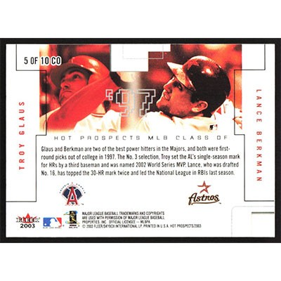 This is a 2003 Hot Prospects Class Of '97 Troy Glaus and Lance Berkman baseball card. The card is #5 and pictures show condition. Team(s): Anaheim Angels/Houston Astros