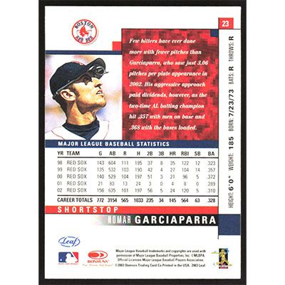 This is a 2003 Leaf Nomar Garciaparra baseball card. The card is #23 and pictures show condition.