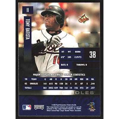 This is a 2003 Playoff Prestige Tony Batista baseball card. The card is #11 and pictures show condition.