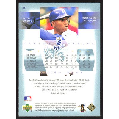 This is a 2003 SP Authentic Carlos Febles baseball card. The card is #28 and pictures show condition.