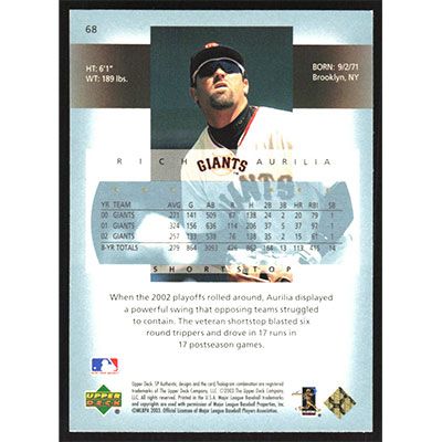 This is a 2003 SP Authentic Rich Aurilia baseball card. The card is #68 and pictures show condition.