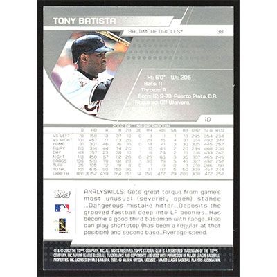 This is a 2003 Stadium Club Tony Batista baseball card. The card is #10 and pictures show condition.