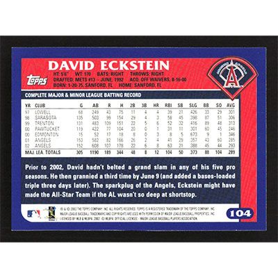 This is a 2003 Topps David Eckstein baseball card. The card is #104 and pictures show condition.