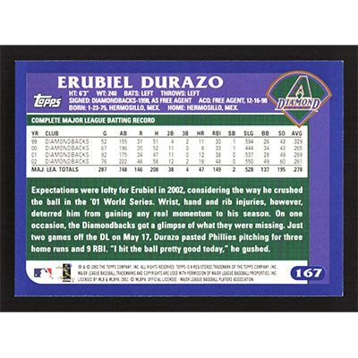 This is a 2003 Topps Erubiel Durazo baseball card. The card is #167 and pictures show condition.