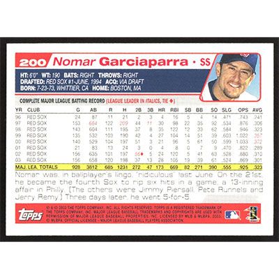 This is a 2003 Topps Nomar Garciaparra baseball card. The card is #200 and pictures show condition.