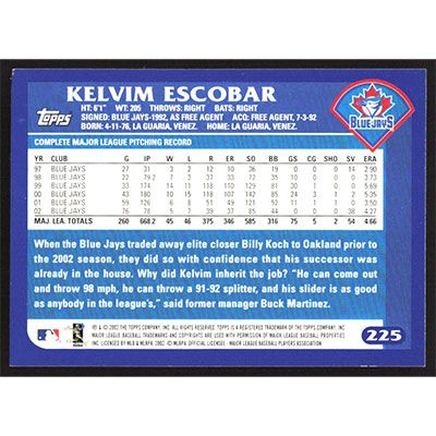 This is a 2003 Topps Kelvim Escobar baseball card. The card is #225 and pictures show condition.